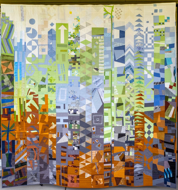 Pandemic Reflections was made by the Modern Fusion Group, a group of individual members of the Modern Quilt Guild from across the US, Canada and Asia. Our group has not met in person. We started meeting by Zoom in November 2020 and decided to make a quilt "together" as a way to process all of the emotions and inspirations coming from our individual experiences during the pandemic. We selected a color palette moving from darker to lighter to reflect our emotions from the start of the pandemic and moving towards hope of its end. Emotions working through a traumatic time can also be reflected in the process of recovering from a natural disaster. What better use of the award-winning quilt than to raise money for hurricane relief. All proceeds of the fundraiser will benefit World Central Kitchen who have been providing assistance to those impacted by hurricanes Helene and Milton. The quilt is 84" x 90". It is made from 100% cotton; is machine quilted and has appraised for $4500.